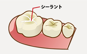 お子さんの奥歯は、歯の表面に溝が多いため、汚れがたまりやすく、その溝からむし歯が発生するリスクがあります。シーラントはその溝へ樹脂を詰めて汚れの付着を防ぎます。